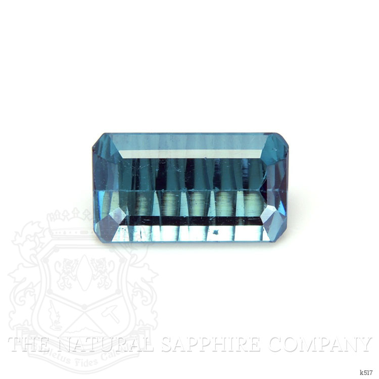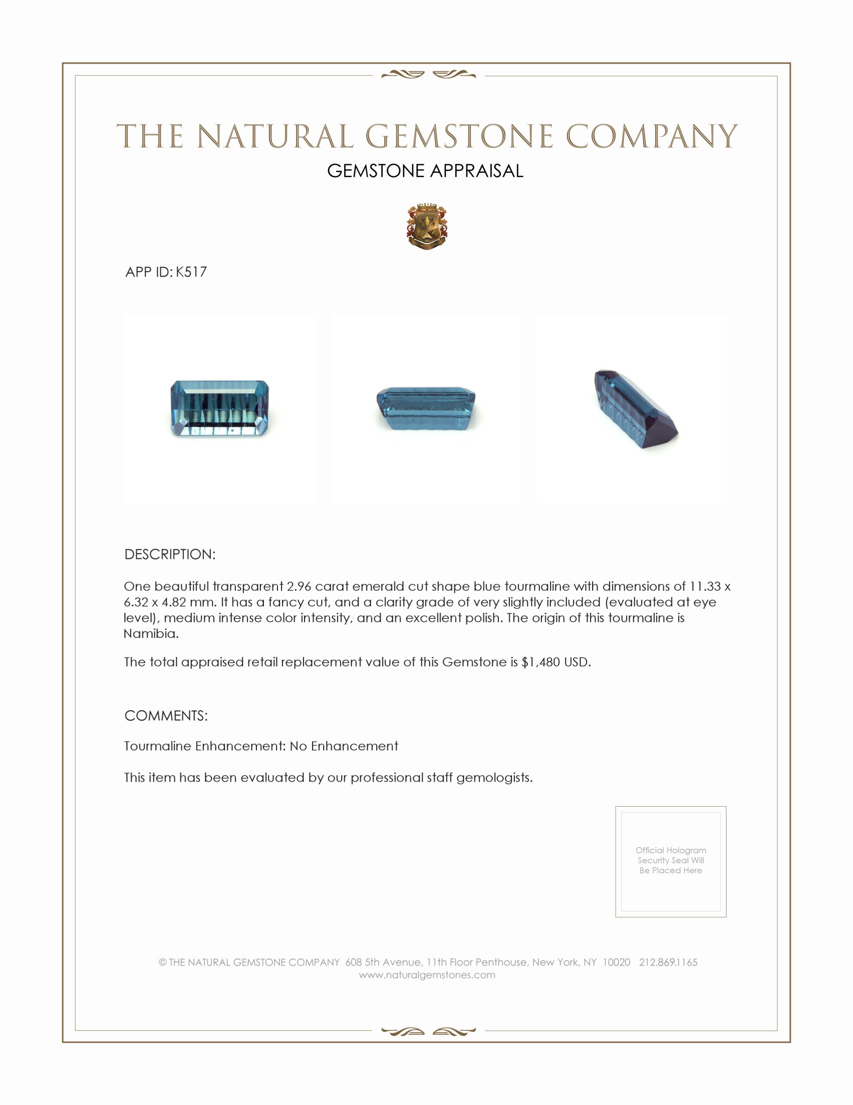 The men's ring features a beautiful, transparent 2.96 carat emerald cut shape blue tourmaline with the dimensions of 11.33 x 6.32 x 4.82 mm and a fancy cut. It has a clarity grade of very slightly included (evaluated at eye level), medium intense color saturation, and an excellent polish. The origin of this tourmaline is Namibia.