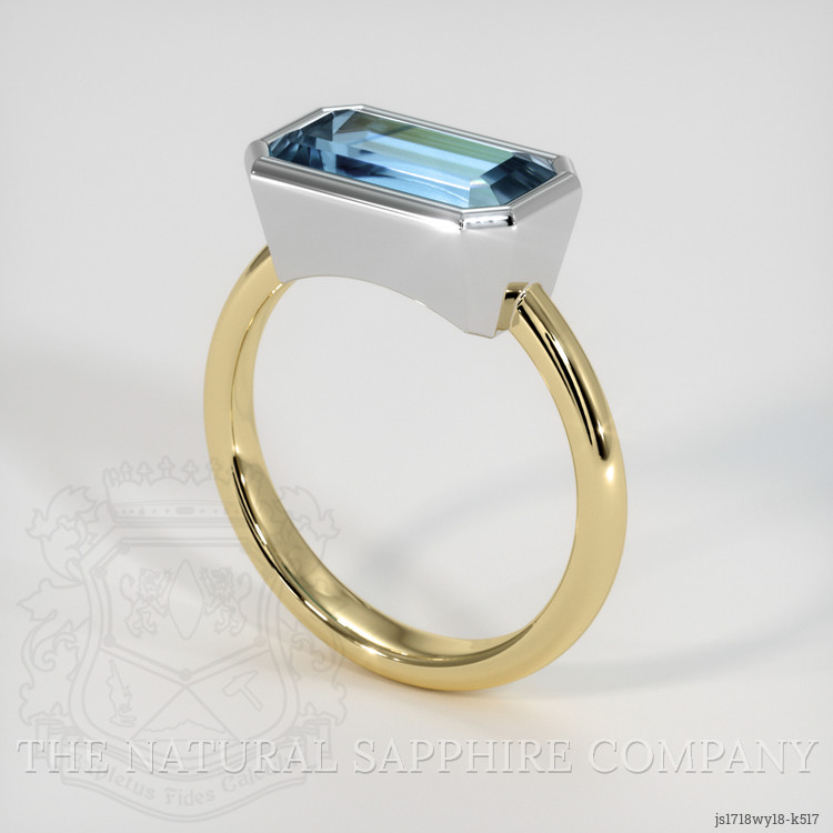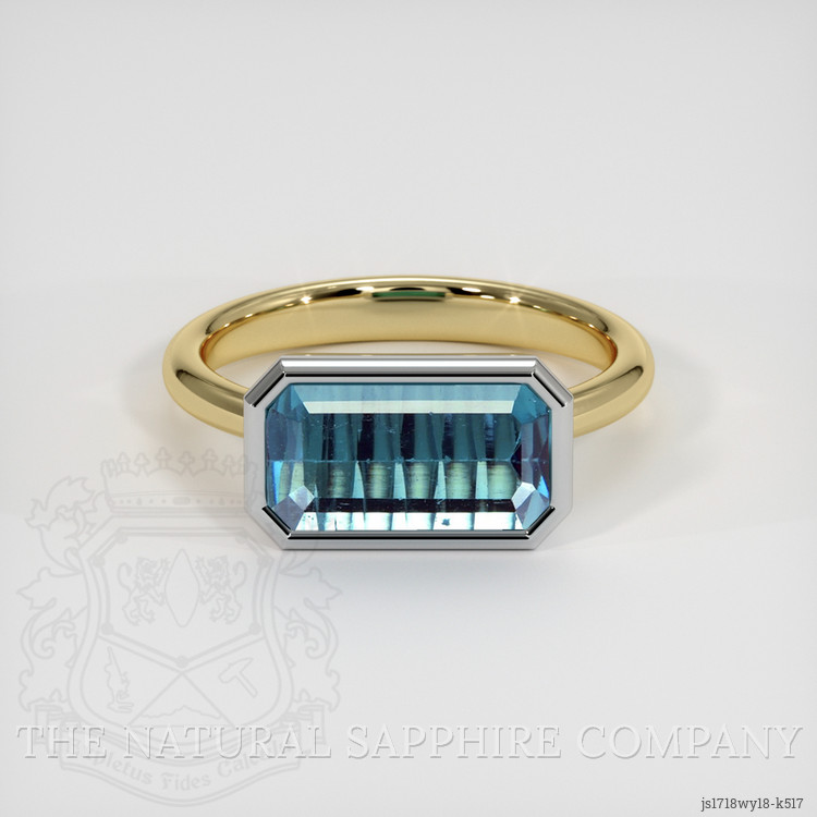 The men's ring features a beautiful, transparent 2.96 carat emerald cut shape blue tourmaline with the dimensions of 11.33 x 6.32 x 4.82 mm and a fancy cut. It has a clarity grade of very slightly included (evaluated at eye level), medium intense color saturation, and an excellent polish. The origin of this tourmaline is Namibia.