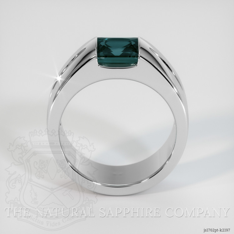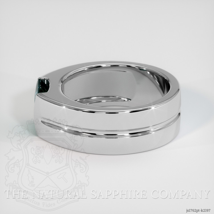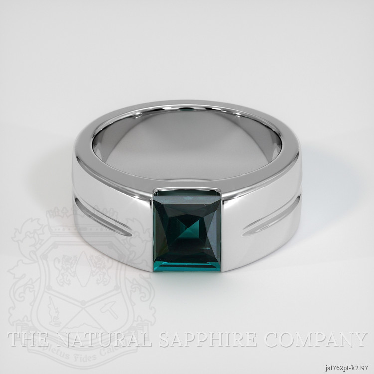 The men's ring features a beautiful, transparent 1.63 carat princess shape bluish green cobaltspinel with the dimensions of 7.07 x 6.97 x 4.09 mm and a princess cut. It has a clarity grade of very slightly included (evaluated at eye level), vivid color saturation, and an excellent polish. The origin of this cobaltspinel is Ceylon (Srilanka).