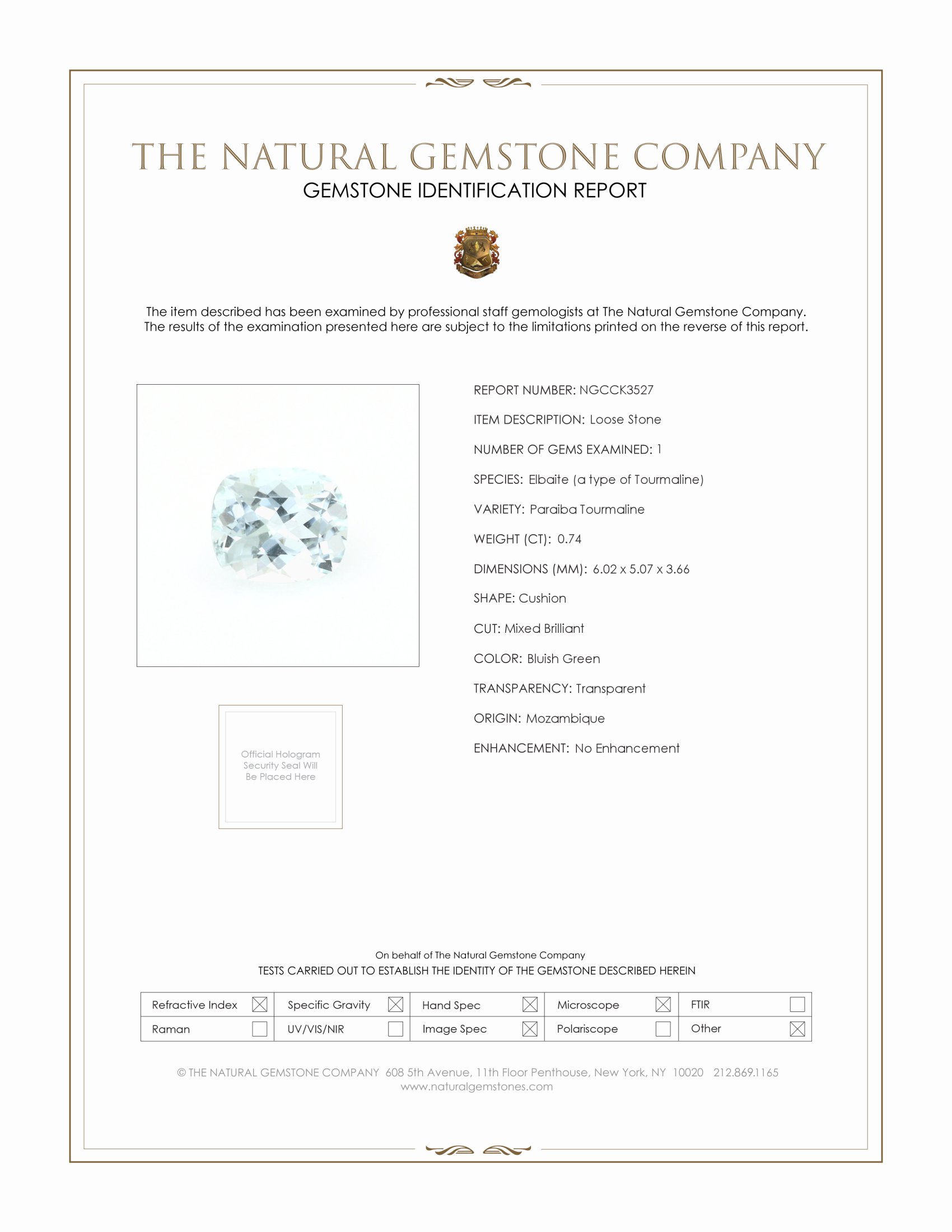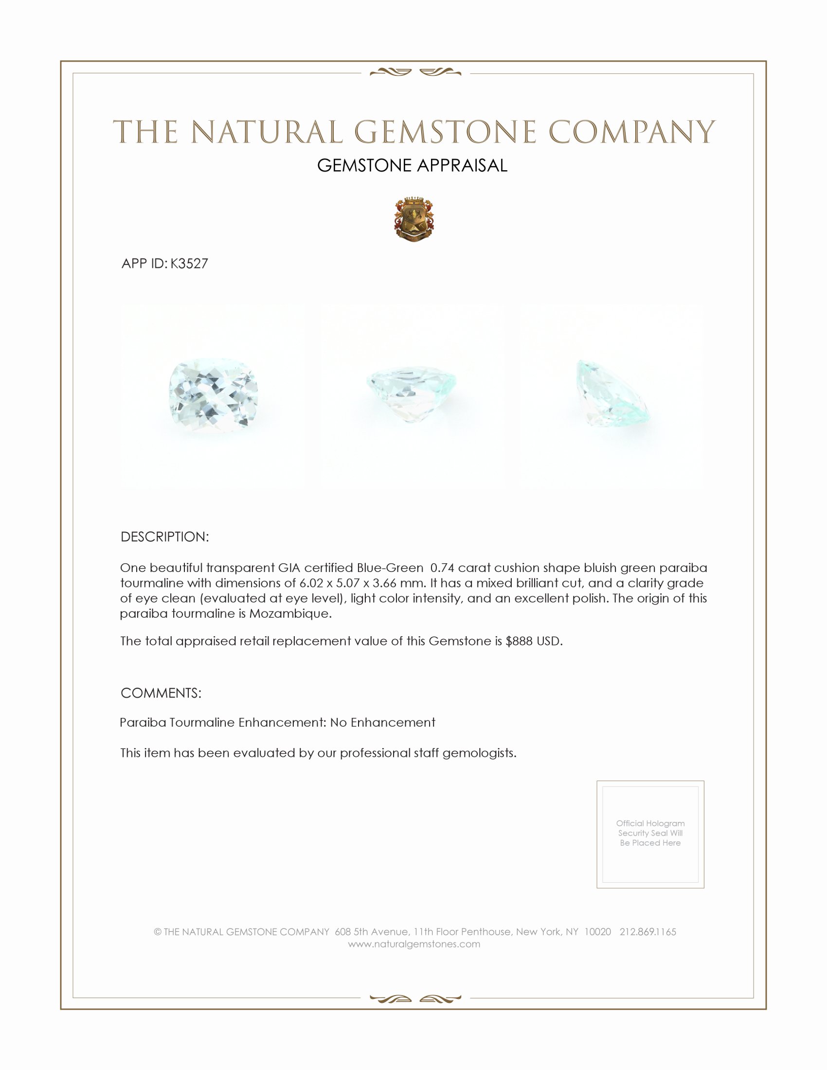 This platinum 950 ring from The Natural Gemstone Company centers on a rare and elegant GIA certified Paraiba tourmaline, weighing 0.74 carat. The stone is cut in a cushion shape with a mixed brilliant cut, and the dimensions measure 6.02 by 5.07 by 3.66 millimeters, proportions that balance presence and wearability. Evaluated as eye clean at typical viewing distance, this bluish green gem exhibits light color saturation and an excellent polish. The GIA certification confirms the gemological attributes and provides independent verification of weight, cut description, and origin, which in this case is Mozambique. There is no enhancement indicated, a detail that matters to collectors and connoisseurs who place a premium on natural, untreated material, especially with a copper bearing tourmaline family member such as Paraiba.