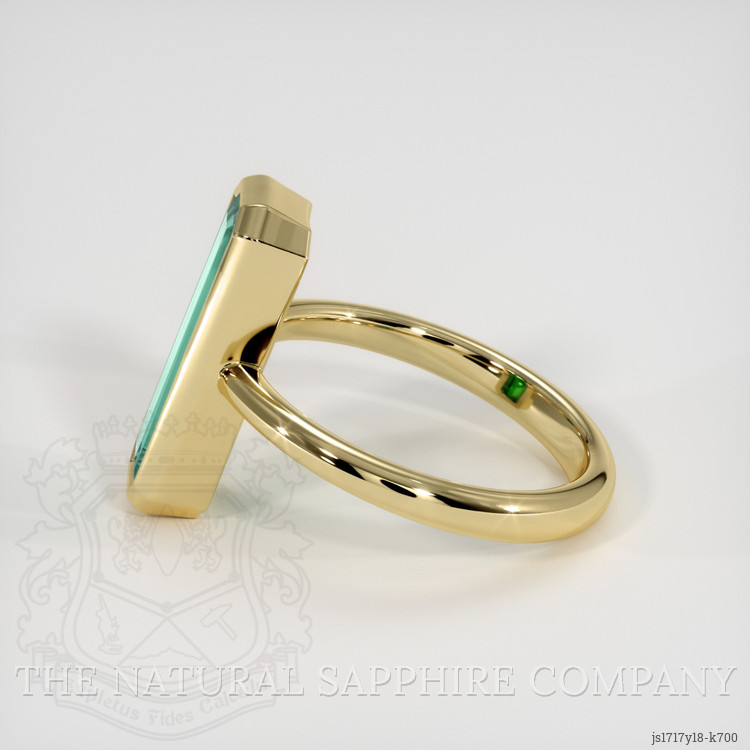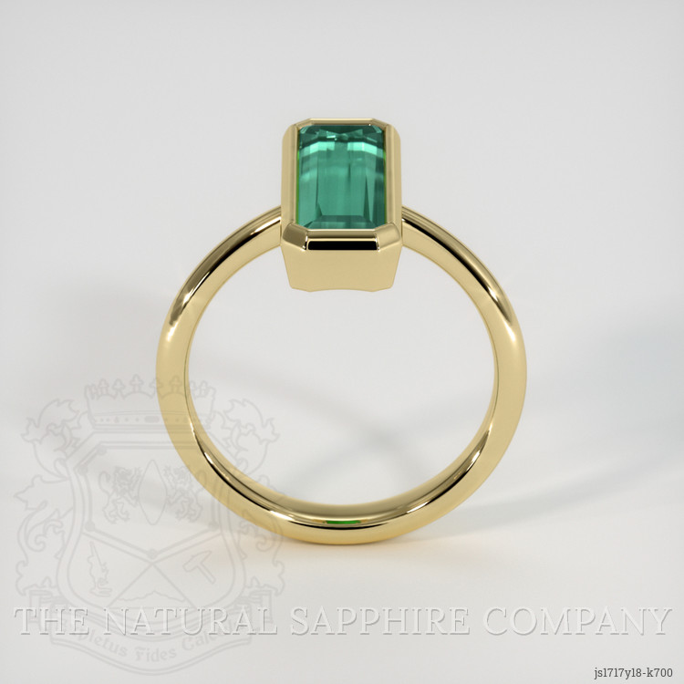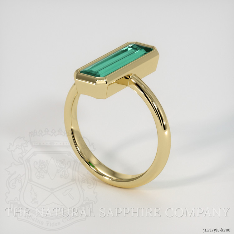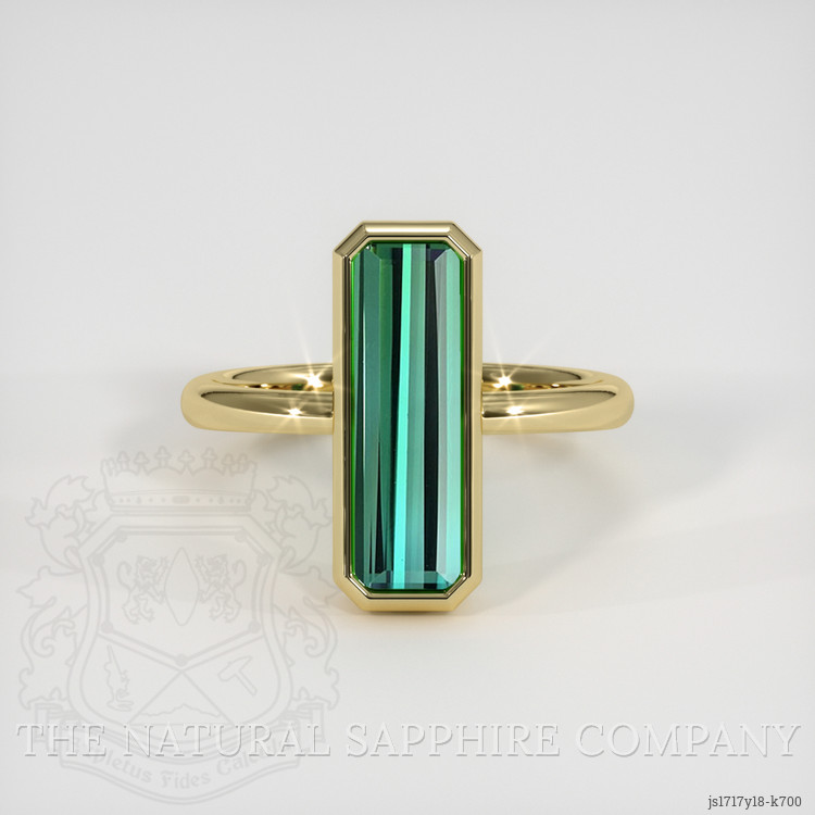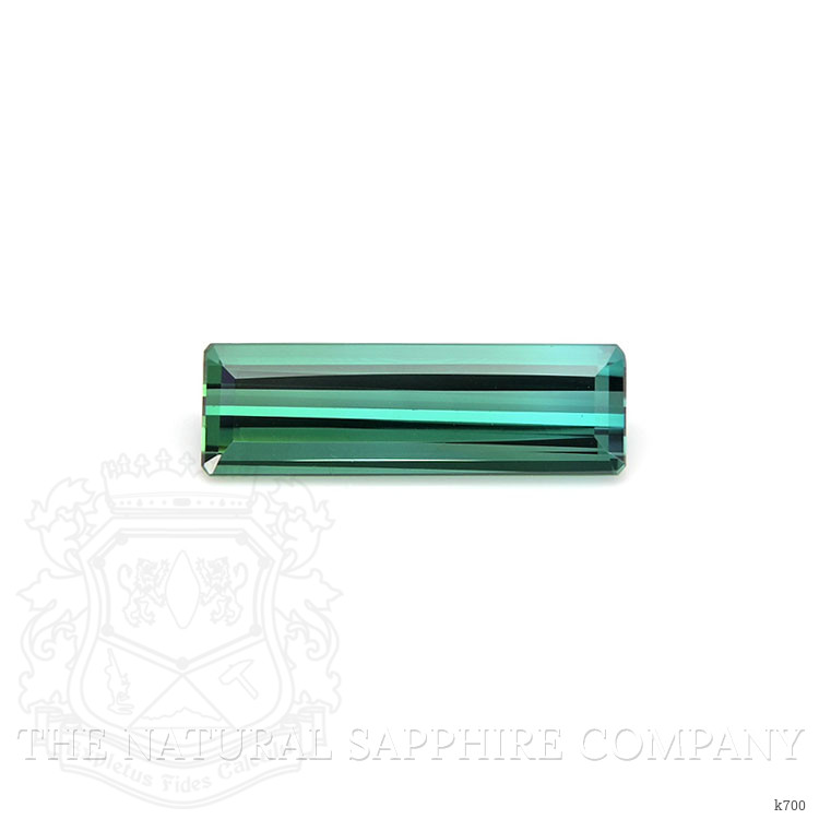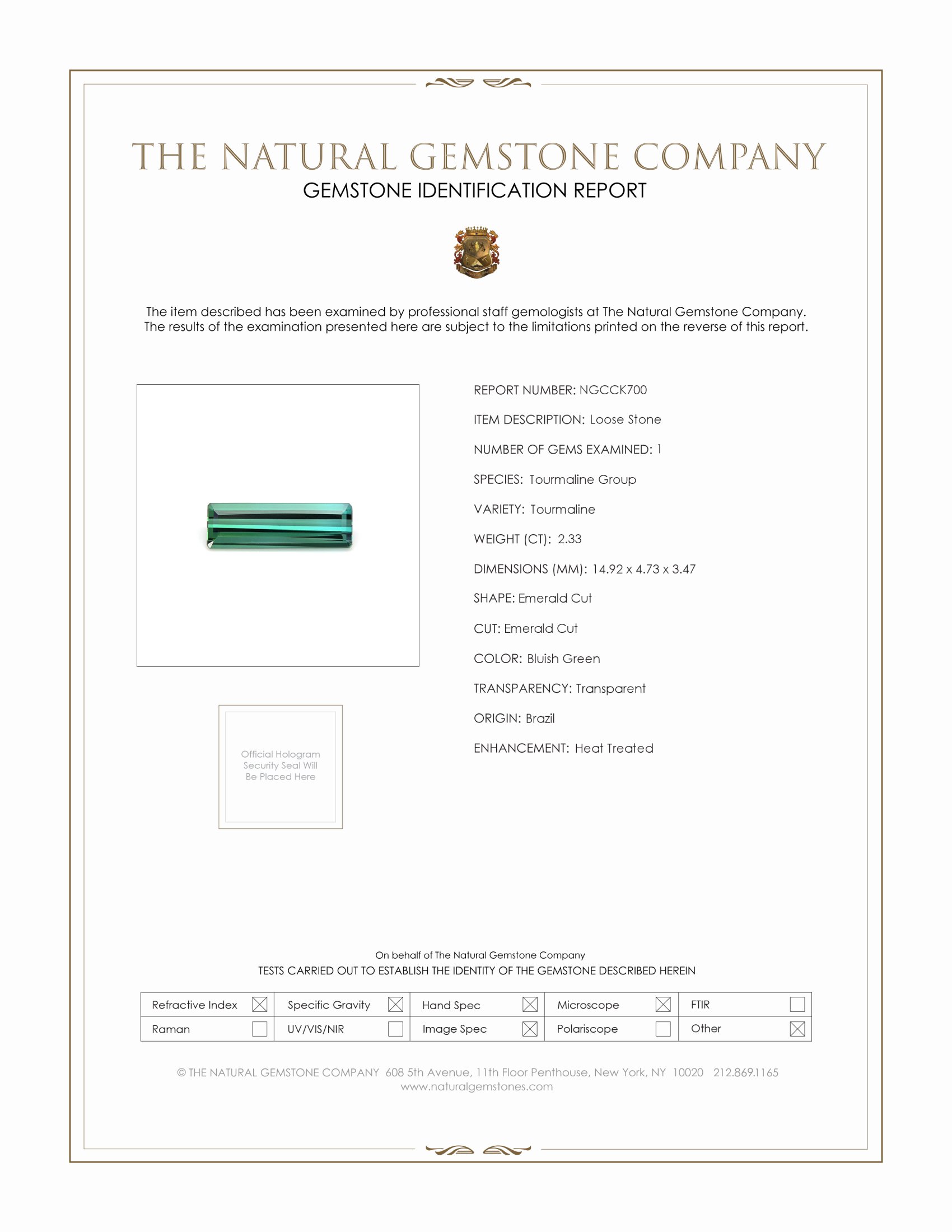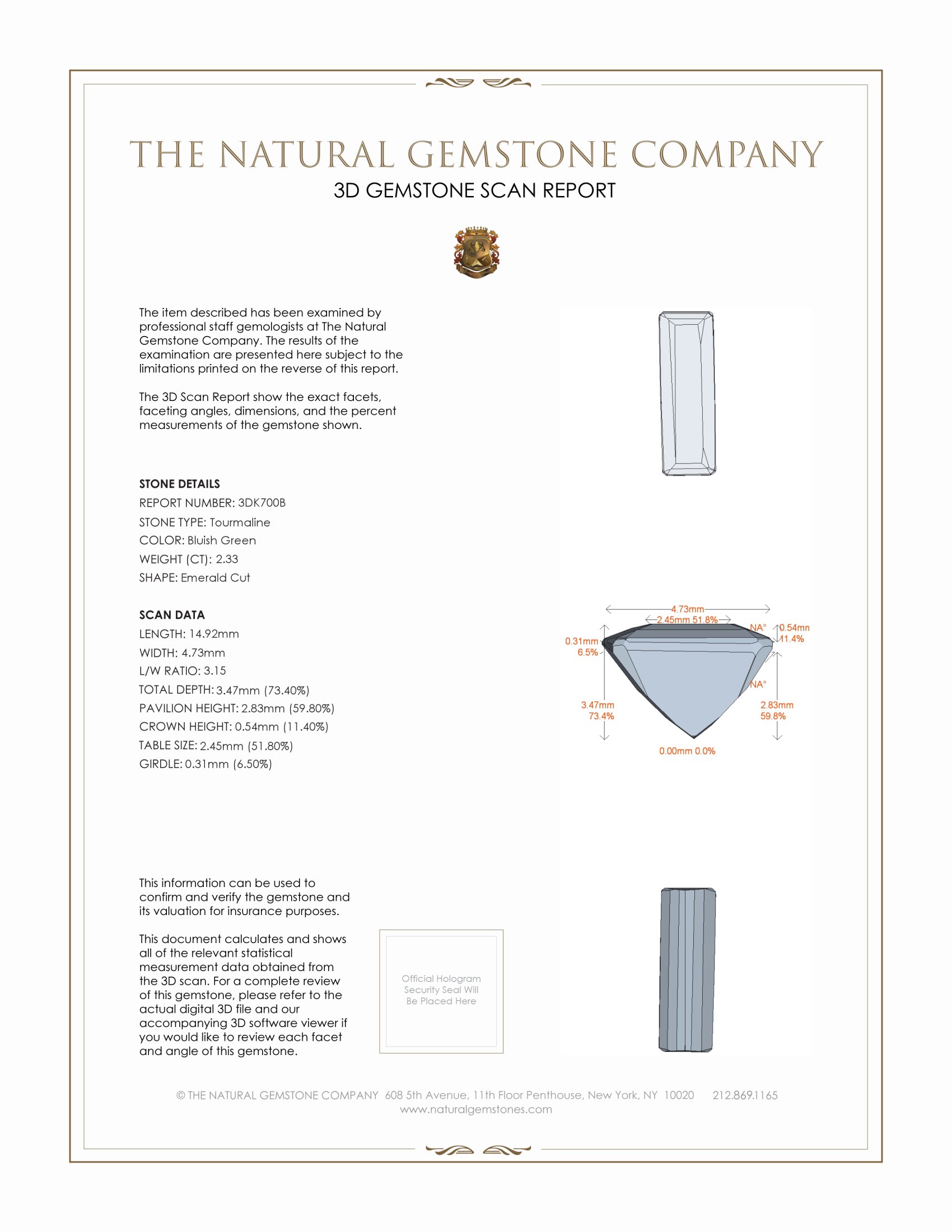 The men's ring features a beautiful, transparent 2.33 carat emerald cut shape bluish green tourmaline with the dimensions of 14.92 x 4.73 x 3.47 mm and a emerald cut. It has a clarity grade of eye clean (evaluated at eye level), medium intense color saturation, and an excellent polish. The origin of this tourmaline is Brazil.