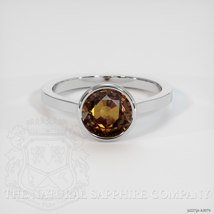The men's ring features a beautiful, transparent 1.83 carat round shape brownish green demantoidgarnet with the dimensions of 7.83 x 7.77 x 4.01 mm and a mixed brilliant cut. It has a clarity grade of very slightly included (evaluated at eye level), intense color saturation, and an excellent polish. The origin of this demantoidgarnet is Madagascar.