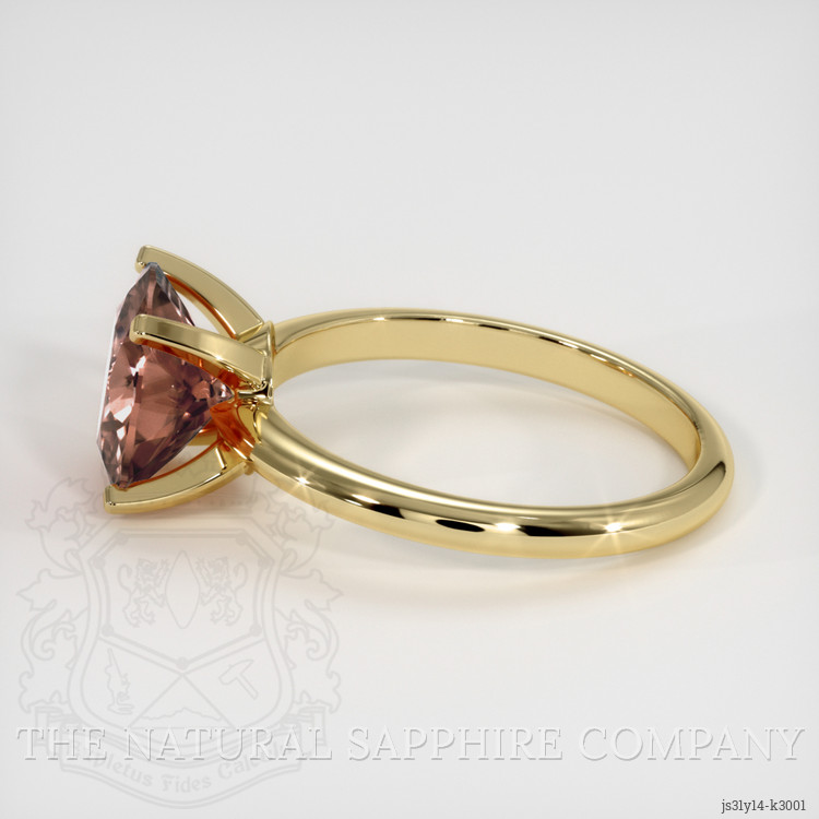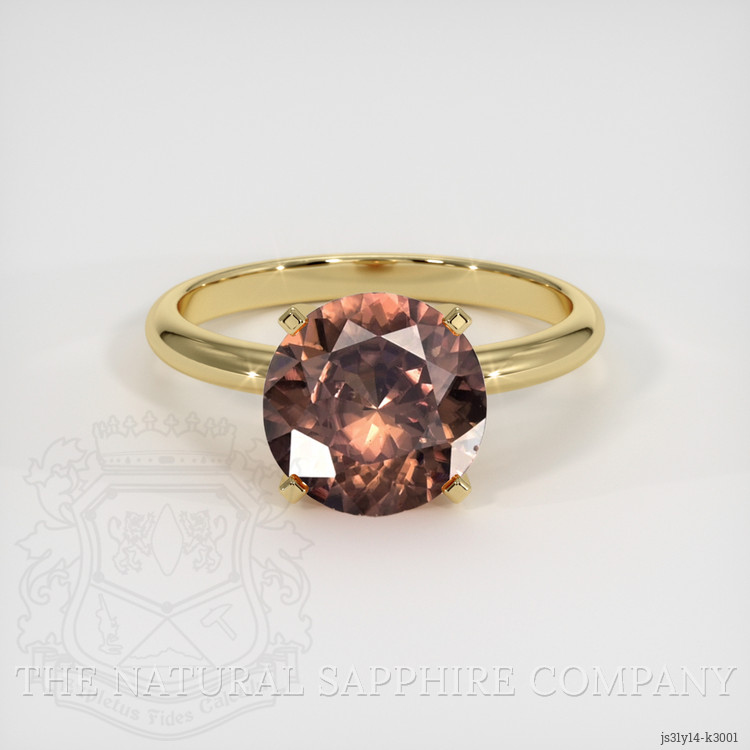 The ring features a beautiful, transparent 3.34 carat round shape brown zircon with the dimensions of 9.02 x 8.96 x 4.83 mm and a mixed brilliant cut. It has a clarity grade of very slightly included (evaluated at eye level), intense color saturation, and an excellent polish. The origin of this zircon is Ceylon (Sri Lanka).