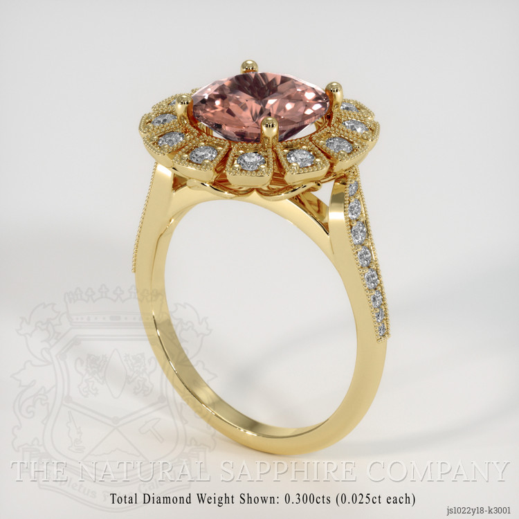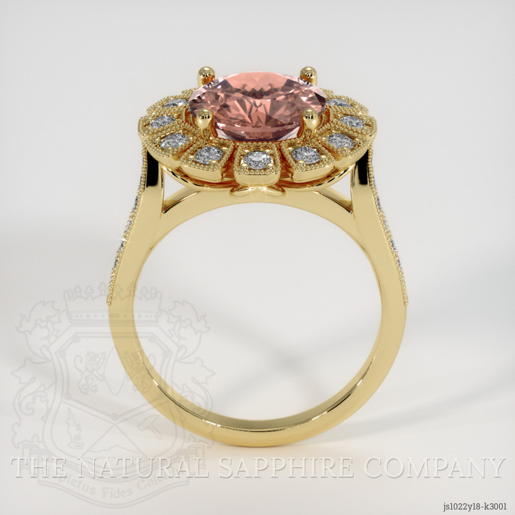 The ring features a beautiful, transparent 3.34 carat round shape brown zircon with the dimensions of 9.02 x 8.96 x 4.83 mm and a mixed brilliant cut. It has a clarity grade of very slightly included (evaluated at eye level), intense color saturation, and an excellent polish. The origin of this zircon is Ceylon (Sri Lanka).