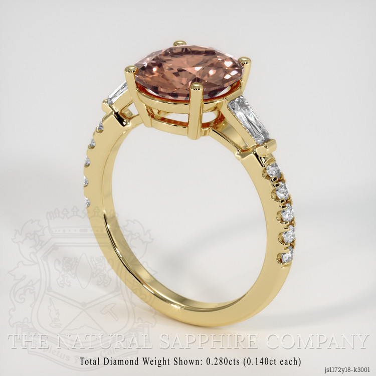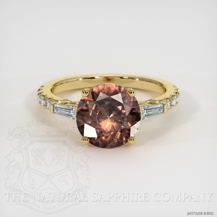 The ring features a beautiful, transparent 3.34 carat round shape brown zircon with the dimensions of 9.02 x 8.96 x 4.83 mm and a mixed brilliant cut. It has a clarity grade of very slightly included (evaluated at eye level), intense color saturation, and an excellent polish. The origin of this zircon is Ceylon (Sri Lanka).