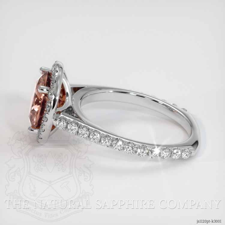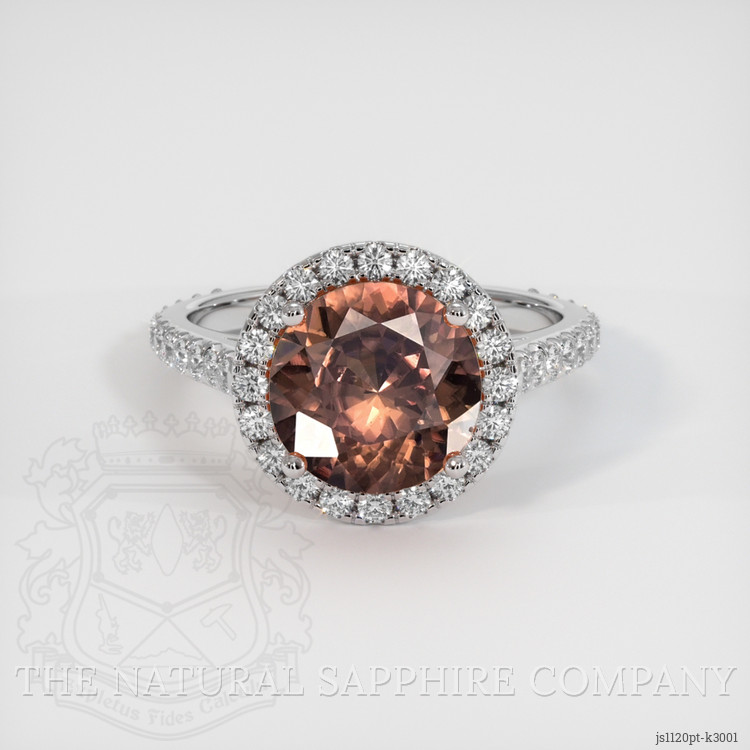 The ring features a beautiful, transparent 3.34 carat round shape brown zircon with the dimensions of 9.02 x 8.96 x 4.83 mm and a mixed brilliant cut. It has a clarity grade of very slightly included (evaluated at eye level), intense color saturation, and an excellent polish. The origin of this zircon is Ceylon (Sri Lanka).
