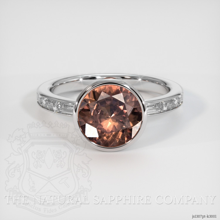 The ring features a beautiful, transparent 3.34 carat round shape brown zircon with the dimensions of 9.02 x 8.96 x 4.83 mm and a mixed brilliant cut. It has a clarity grade of very slightly included (evaluated at eye level), intense color saturation, and an excellent polish. The origin of this zircon is Ceylon (Sri Lanka).
