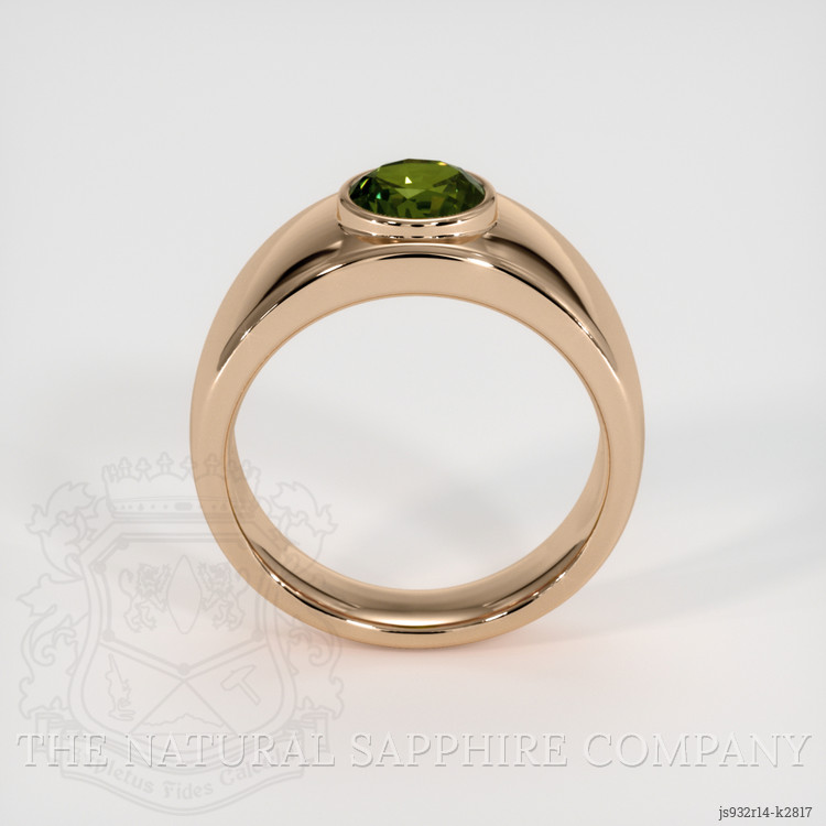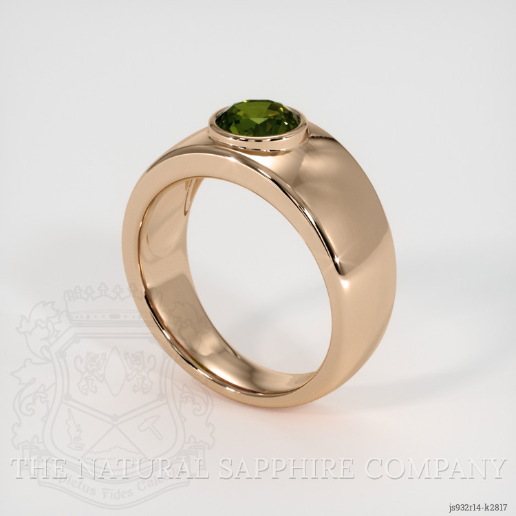 The men's ring features a beautiful, transparent 1.37 carat round shape brownish green chrysoberyl with the dimensions of 6.49 x 6.49 x 4.16 mm and a mixed brilliant cut. It has a clarity grade of very slightly included (evaluated at eye level), intense color saturation, and an excellent polish. The origin of this chrysoberyl is Madagascar.