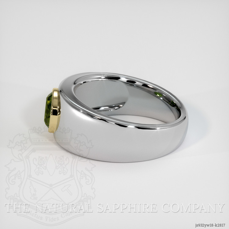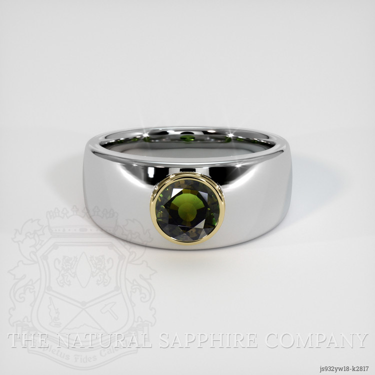 The men's ring features a beautiful, transparent 1.37 carat round shape brownish green chrysoberyl with the dimensions of 6.49 x 6.49 x 4.16 mm and a mixed brilliant cut. It has a clarity grade of very slightly included (evaluated at eye level), intense color saturation, and an excellent polish. The origin of this chrysoberyl is Madagascar.