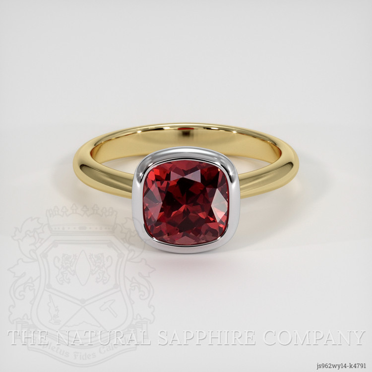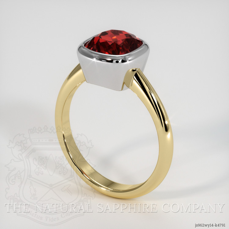 Its setting, crafted entirely in 18K white gold and 18K yellow gold, is designed to amplify the rich, vivid hue and exceptional clarity of the garnet. The 18K white gold provides a sophisticated contrast to the stone, accentuating its color by reflecting light directly into the gemstone. This metal choice also enhances the overall brightness and brilliance of the garnet.