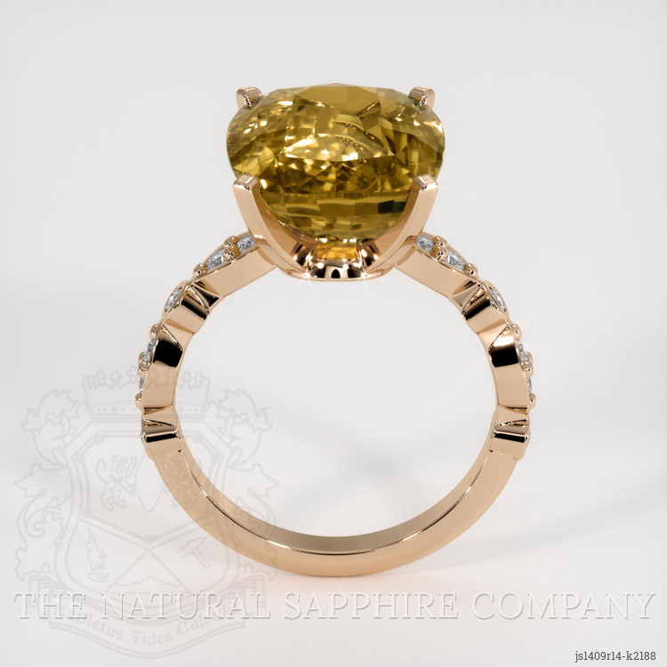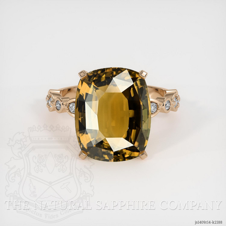 The ring features a beautiful, transparent 8.54 carat cushion shape golden brown sinhalite with the dimensions of 13.72 x 11.11 x 6.63 mm and a mixed brilliant cut. It has a clarity grade of very slightly included (evaluated at eye level), intense color saturation, and an excellent polish. The origin of this sinhalite is Ceylon (Sri Lanka).