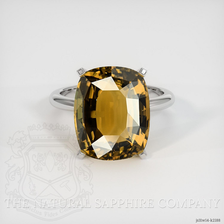The ring features a beautiful, transparent 8.54 carat cushion shape golden brown sinhalite with the dimensions of 13.72 x 11.11 x 6.63 mm and a mixed brilliant cut. It has a clarity grade of very slightly included (evaluated at eye level), intense color saturation, and an excellent polish. The origin of this sinhalite is Ceylon (Sri Lanka).