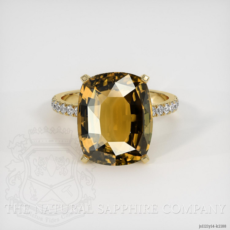 The ring features a beautiful, transparent 8.54 carat cushion shape golden brown sinhalite with the dimensions of 13.72 x 11.11 x 6.63 mm and a mixed brilliant cut. It has a clarity grade of very slightly included (evaluated at eye level), intense color saturation, and an excellent polish. The origin of this sinhalite is Ceylon (Sri Lanka).