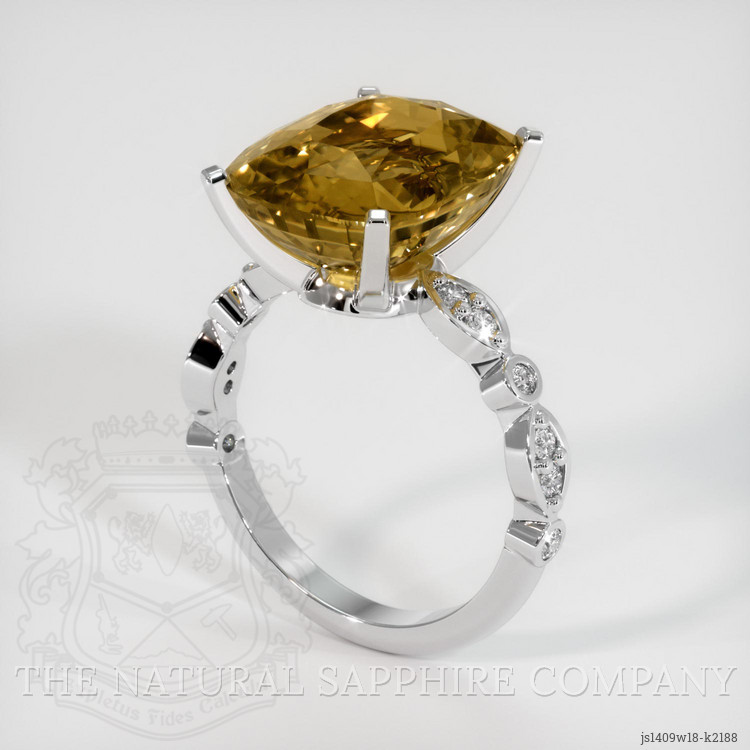 The ring features a beautiful, transparent 8.54 carat cushion shape golden brown sinhalite with the dimensions of 13.72 x 11.11 x 6.63 mm and a mixed brilliant cut. It has a clarity grade of very slightly included (evaluated at eye level), intense color saturation, and an excellent polish. The origin of this sinhalite is Ceylon (Sri Lanka).