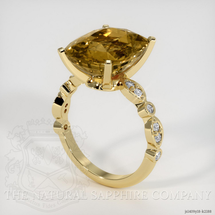 The ring features a beautiful, transparent 8.54 carat cushion shape golden brown sinhalite with the dimensions of 13.72 x 11.11 x 6.63 mm and a mixed brilliant cut. It has a clarity grade of very slightly included (evaluated at eye level), intense color saturation, and an excellent polish. The origin of this sinhalite is Ceylon (Sri Lanka).