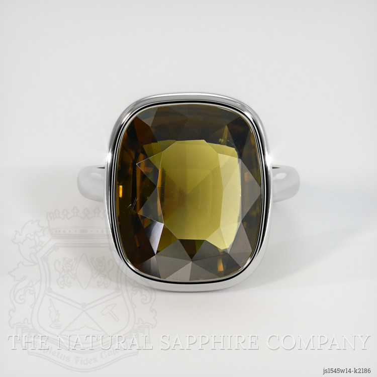 The men's ring features a beautiful, transparent 11.16 carat cushion shape golden brownish green sinhalite with the dimensions of 15.85 x 13.14 x 6.95 mm and a mixed brilliant cut. It has a clarity grade of very slightly included (evaluated at eye level), intense color saturation, and an excellent polish. The origin of this sinhalite is Ceylon (Sri Lanka).