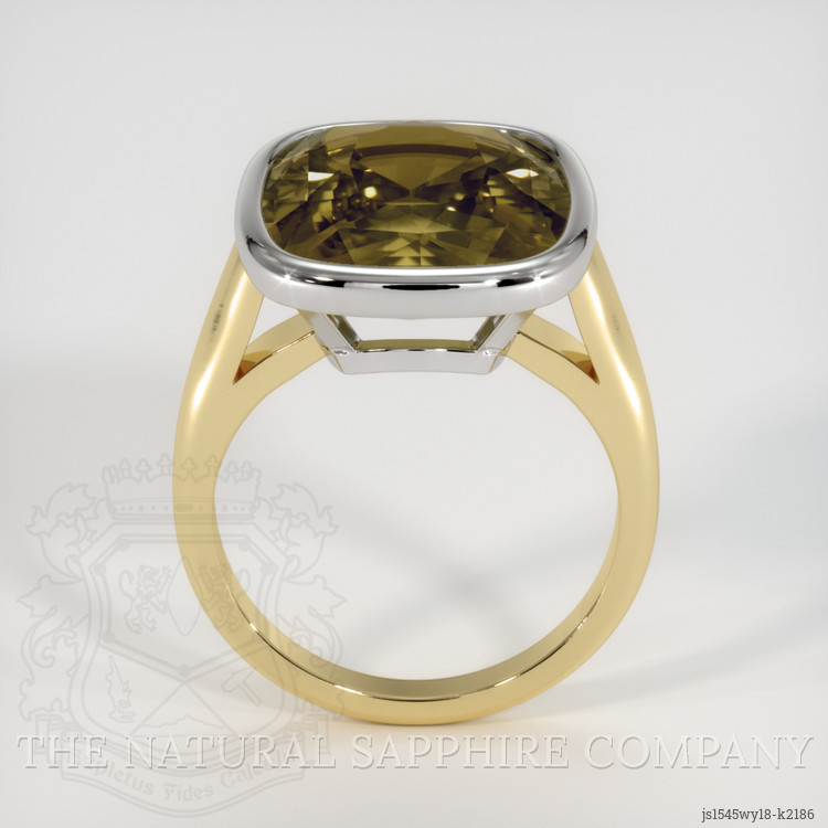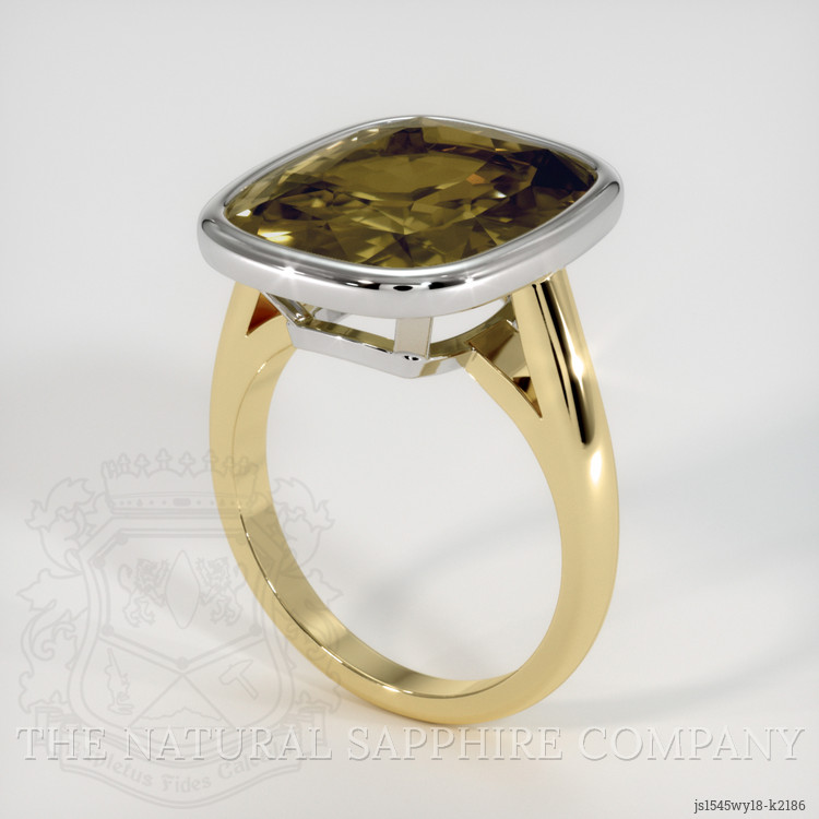 The men's ring features a beautiful, transparent 11.16 carat cushion shape golden brownish green sinhalite with the dimensions of 15.85 x 13.14 x 6.95 mm and a mixed brilliant cut. It has a clarity grade of very slightly included (evaluated at eye level), intense color saturation, and an excellent polish. The origin of this sinhalite is Ceylon (Sri Lanka).