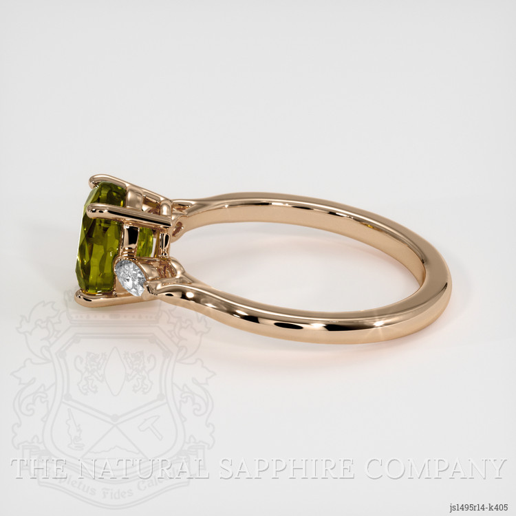 The ring features a beautiful, transparent 1.69 carat cushion shape green andalusite with the dimensions of 7.78 x 6.01 x 4.68 mm and a mixed brilliant cut. It has a clarity grade of very slightly included (evaluated at eye level), intense color saturation, and an excellent polish. The origin of this andalusite is Australia.