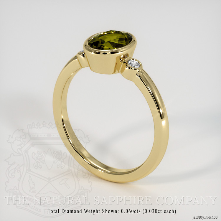 The ring features a beautiful, transparent 1.69 carat cushion shape green andalusite with the dimensions of 7.78 x 6.01 x 4.68 mm and a mixed brilliant cut. It has a clarity grade of very slightly included (evaluated at eye level), intense color saturation, and an excellent polish. The origin of this andalusite is Australia.