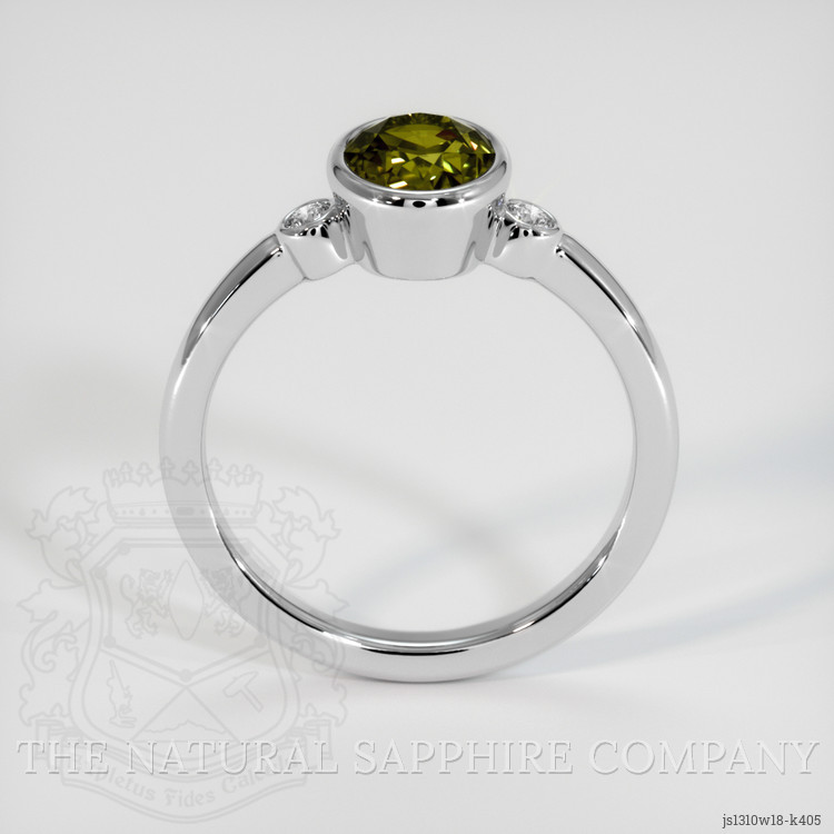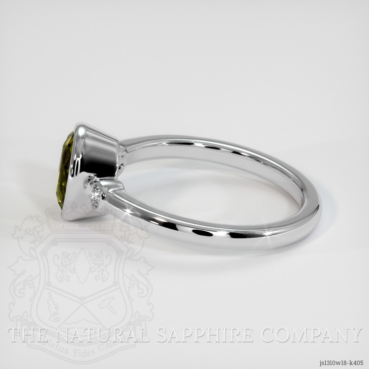 The ring features a beautiful, transparent 1.69 carat cushion shape green andalusite with the dimensions of 7.78 x 6.01 x 4.68 mm and a mixed brilliant cut. It has a clarity grade of very slightly included (evaluated at eye level), intense color saturation, and an excellent polish. The origin of this andalusite is Australia.