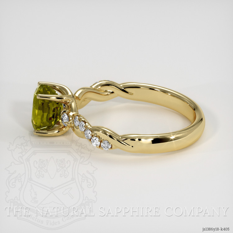 The ring features a beautiful, transparent 1.69 carat cushion shape green andalusite with the dimensions of 7.78 x 6.01 x 4.68 mm and a mixed brilliant cut. It has a clarity grade of very slightly included (evaluated at eye level), intense color saturation, and an excellent polish. The origin of this andalusite is Australia.