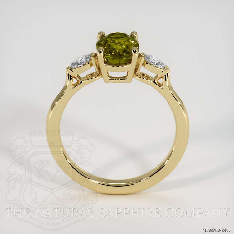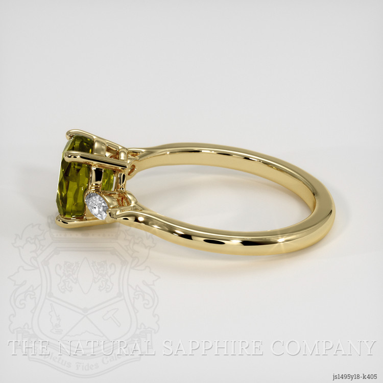 The ring features a beautiful, transparent 1.69 carat cushion shape green andalusite with the dimensions of 7.78 x 6.01 x 4.68 mm and a mixed brilliant cut. It has a clarity grade of very slightly included (evaluated at eye level), intense color saturation, and an excellent polish. The origin of this andalusite is Australia.
