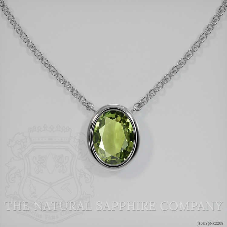 The necklace features a beautiful, transparent 2.25 carat oval shape green chrysoberyl with the dimensions of 9.44 x 7.27 x 3.88 mm and a mixed brilliant cut. It has a clarity grade of very slightly included (evaluated at eye level), medium intense color saturation, and an excellent polish. The origin of this chrysoberyl is Ceylon (Sri Lanka).