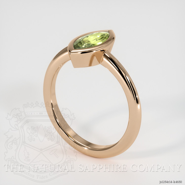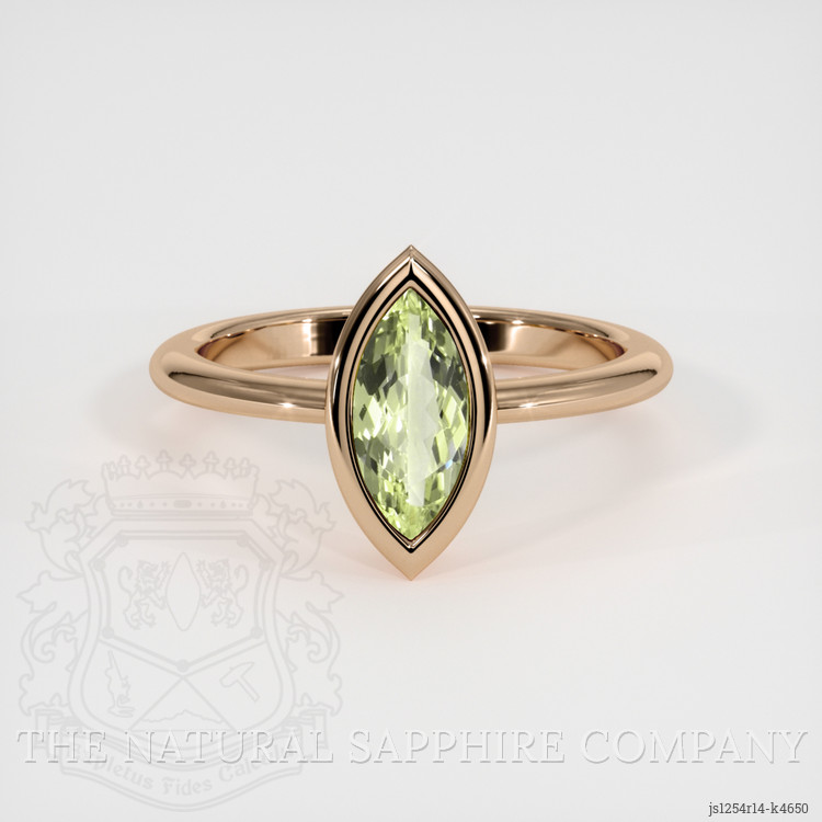The ring features a beautiful, transparent 1.09 carat marquise shape green chrysoberyl with the dimensions of 10.80 x 4.98 x 2.88 mm and a mixed brilliant cut. It has a clarity grade of very slightly included (evaluated at eye level), medium color saturation, and an excellent polish. The origin of this chrysoberyl is Madagascar.