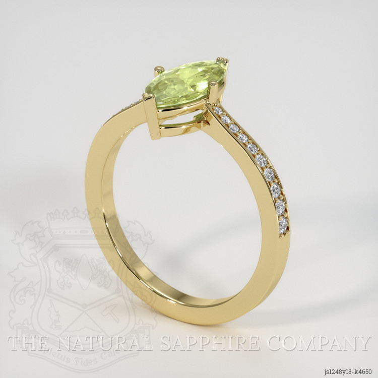 The ring features a beautiful, transparent 1.09 carat marquise shape green chrysoberyl with the dimensions of 10.80 x 4.98 x 2.88 mm and a mixed brilliant cut. It has a clarity grade of very slightly included (evaluated at eye level), medium color saturation, and an excellent polish. The origin of this chrysoberyl is Madagascar.