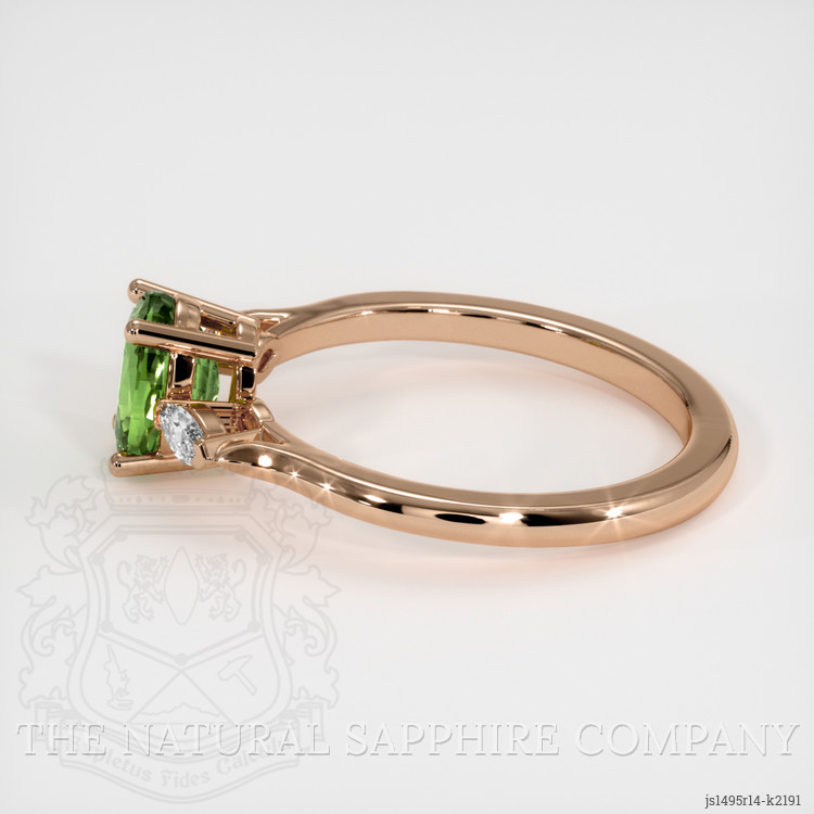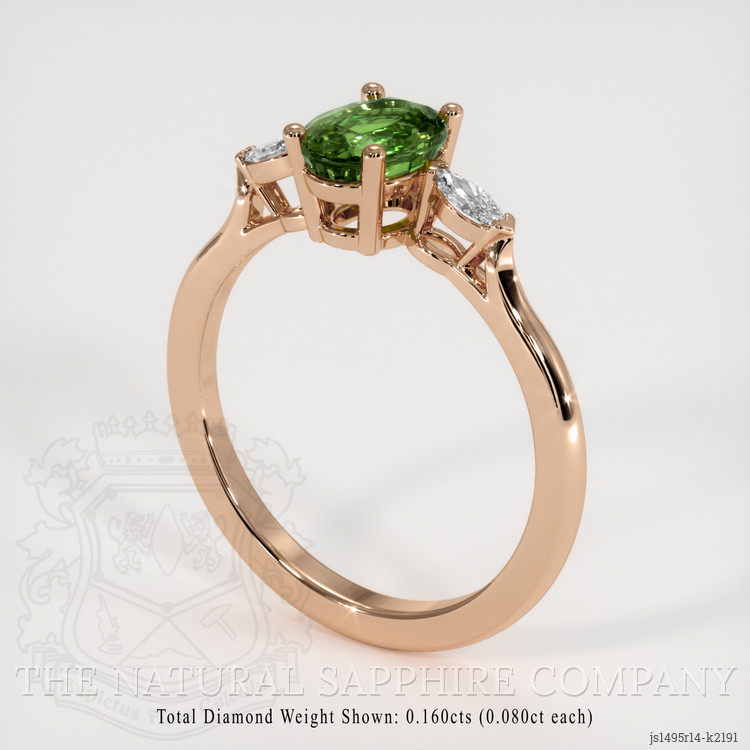 The ring features a beautiful, transparent 1.20 carat oval shape green chrysoberyl with the dimensions of 6.98 x 5.20 x 3.75 mm and a mixed brilliant cut. It has a clarity grade of slightly included (evaluated at eye level), intense color saturation, and an excellent polish. The origin of this chrysoberyl is Ceylon (Sri Lanka).