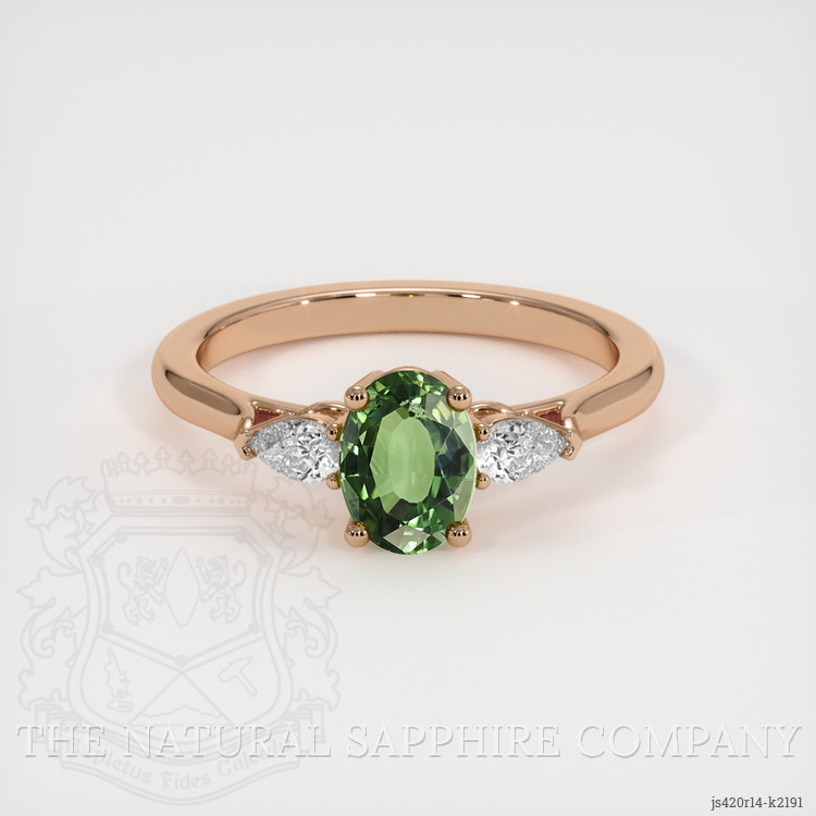 The ring features a beautiful, transparent 1.20 carat oval shape green chrysoberyl with the dimensions of 6.98 x 5.20 x 3.75 mm and a mixed brilliant cut. It has a clarity grade of slightly included (evaluated at eye level), intense color saturation, and an excellent polish. The origin of this chrysoberyl is Ceylon (Sri Lanka).