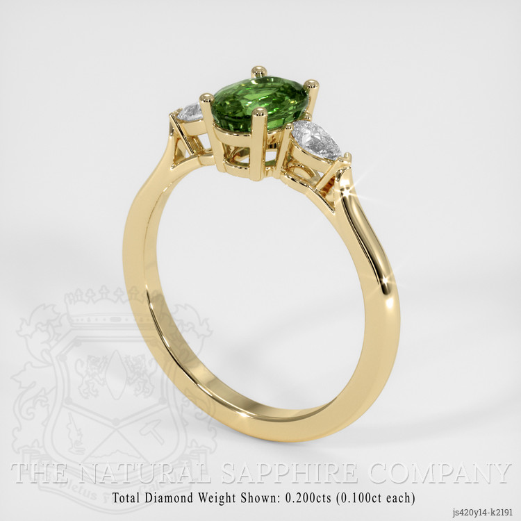 The ring features a beautiful, transparent 1.20 carat oval shape green chrysoberyl with the dimensions of 6.98 x 5.20 x 3.75 mm and a mixed brilliant cut. It has a clarity grade of slightly included (evaluated at eye level), intense color saturation, and an excellent polish. The origin of this chrysoberyl is Ceylon (Sri Lanka).
