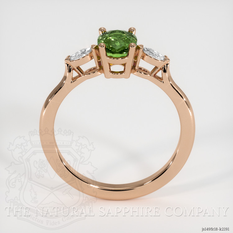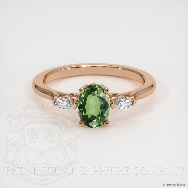 The ring features a beautiful, transparent 1.20 carat oval shape green chrysoberyl with the dimensions of 6.98 x 5.20 x 3.75 mm and a mixed brilliant cut. It has a clarity grade of slightly included (evaluated at eye level), intense color saturation, and an excellent polish. The origin of this chrysoberyl is Ceylon (Sri Lanka).