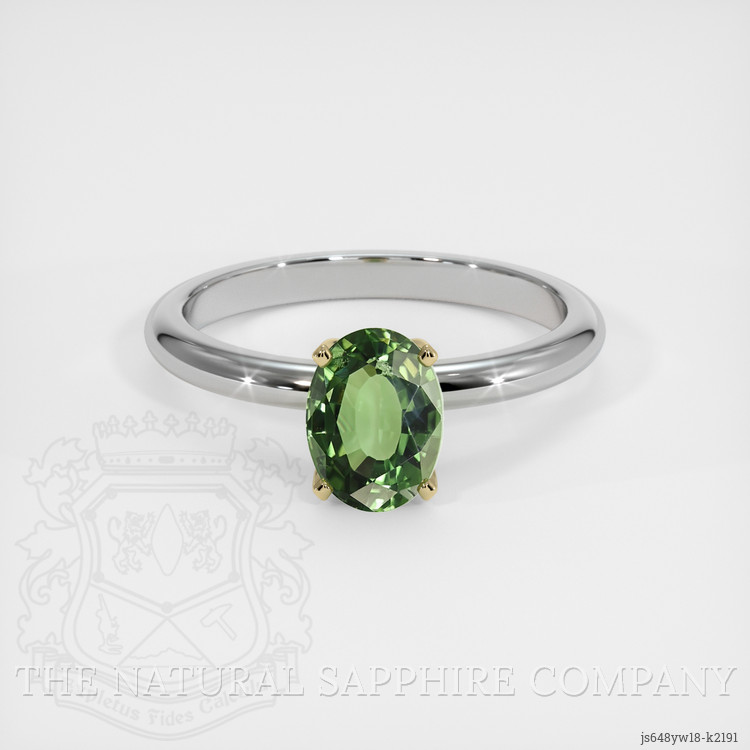 The ring features a beautiful, transparent 1.20 carat oval shape green chrysoberyl with the dimensions of 6.98 x 5.20 x 3.75 mm and a mixed brilliant cut. It has a clarity grade of slightly included (evaluated at eye level), intense color saturation, and an excellent polish. The origin of this chrysoberyl is Ceylon (Sri Lanka).