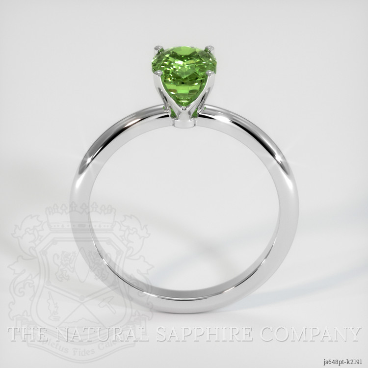 The ring features a beautiful, transparent 1.20 carat oval shape green chrysoberyl with the dimensions of 6.98 x 5.20 x 3.75 mm and a mixed brilliant cut. It has a clarity grade of slightly included (evaluated at eye level), intense color saturation, and an excellent polish. The origin of this chrysoberyl is Ceylon (Sri Lanka).