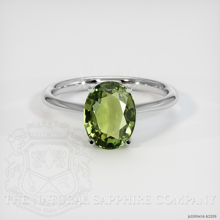 The ring features a beautiful, transparent 2.25 carat oval shape green chrysoberyl with the dimensions of 9.44 x 7.27 x 3.88 mm and a mixed brilliant cut. It has a clarity grade of very slightly included (evaluated at eye level), medium intense color saturation, and an excellent polish. The origin of this chrysoberyl is Ceylon (Sri Lanka).