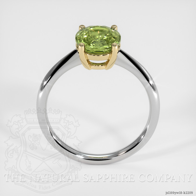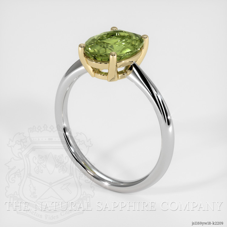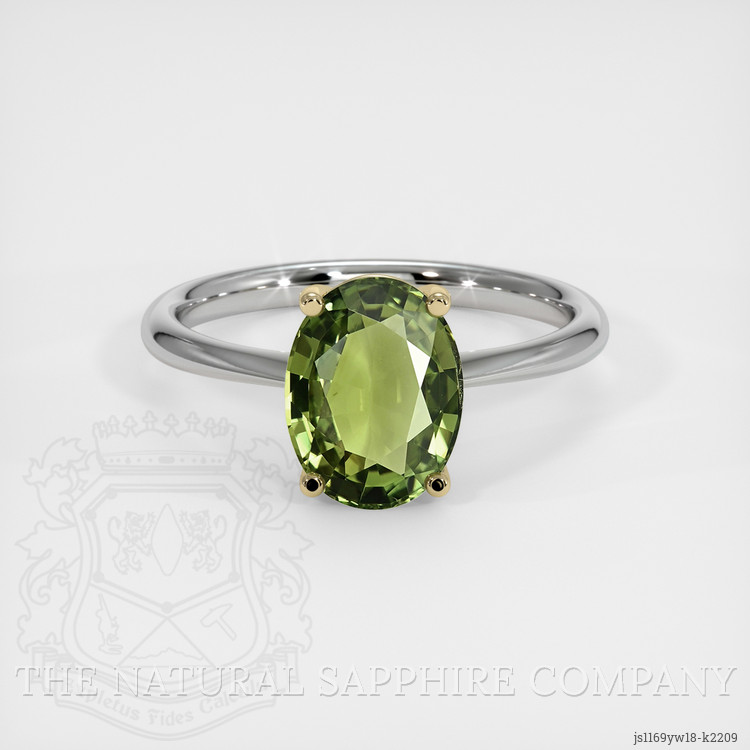 The ring features a beautiful, transparent 2.25 carat oval shape green chrysoberyl with the dimensions of 9.44 x 7.27 x 3.88 mm and a mixed brilliant cut. It has a clarity grade of very slightly included (evaluated at eye level), medium intense color saturation, and an excellent polish. The origin of this chrysoberyl is Ceylon (Sri Lanka).