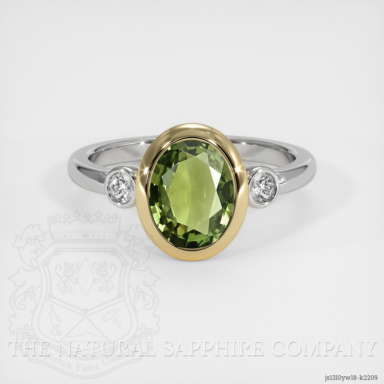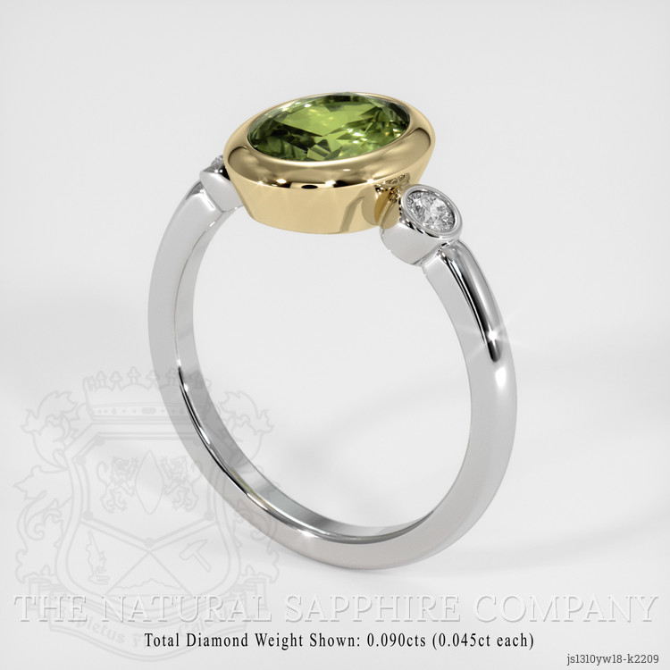 The ring features a beautiful, transparent 2.25 carat oval shape green chrysoberyl with the dimensions of 9.44 x 7.27 x 3.88 mm and a mixed brilliant cut. It has a clarity grade of very slightly included (evaluated at eye level), medium intense color saturation, and an excellent polish. The origin of this chrysoberyl is Ceylon (Sri Lanka).