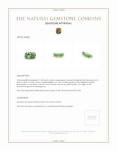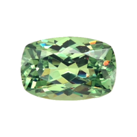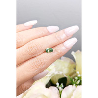 The ring features a beautiful, transparent 1.38 carat cushion shape green demantoidgarnet with the dimensions of 8.09 x 5.45 x 3.59 mm and a mixed brilliant cut. It has a clarity grade of very slightly included (evaluated at eye level), intense color saturation, and an excellent polish. The origin of this demantoidgarnet is Madagascar.