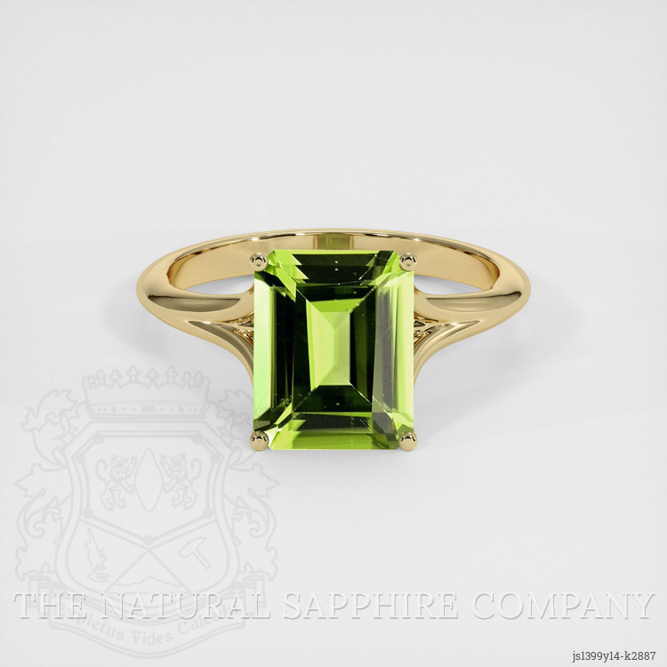 This exquisite ring features a captivating 2.77 carat emerald cut green peridot. With the dimensions of 9.98 by 7.99 by 4.59 millimeters, the gemstone showcases a stunning emerald cut that enhances its luminous transparency. Graded as very slightly included at eye level, it exhibits intense color saturation, highlighting the peridot's vibrant green hue. The stone possesses an excellent polish, contributing to its exceptional brilliance and allure. Originating from Pakistan, this peridot boasts a rich heritage that enhances its uniqueness and appeal to discerning buyers who appreciate provenance and quality.