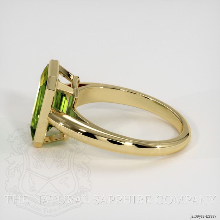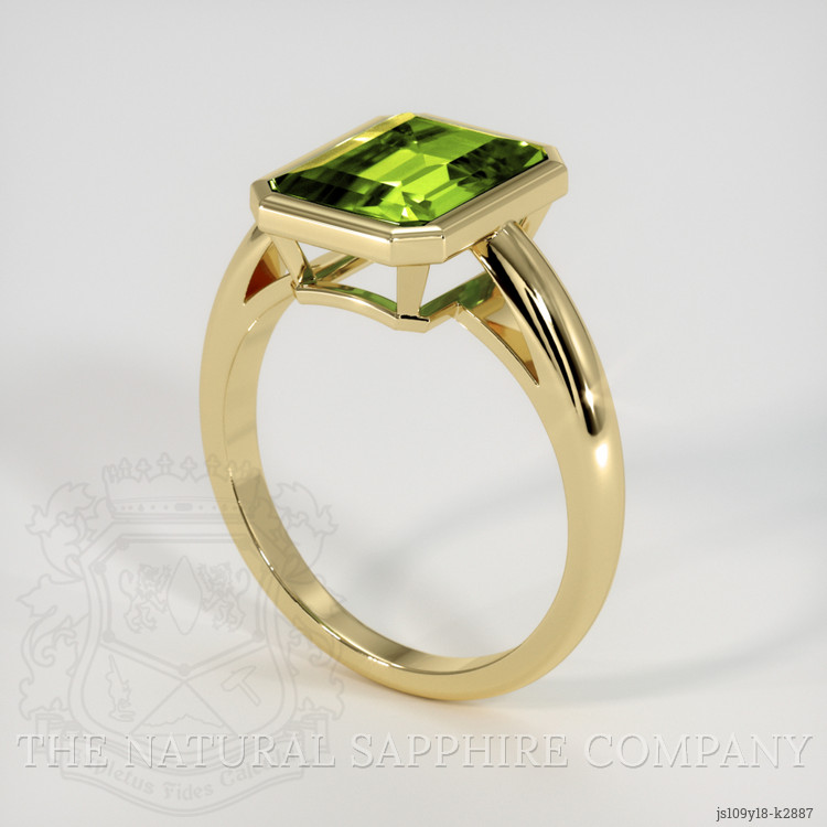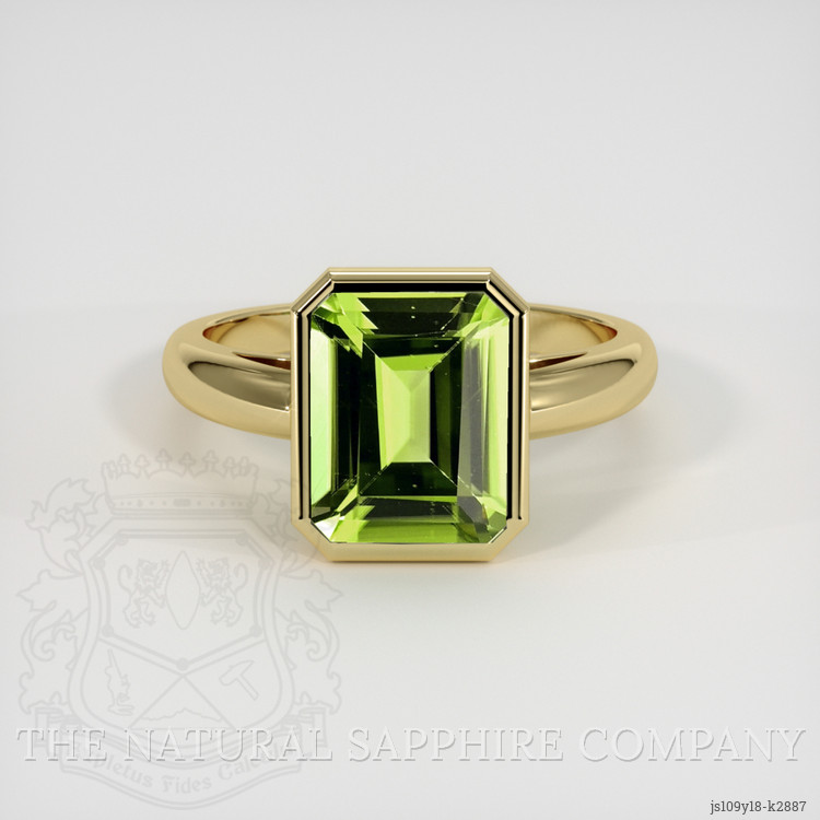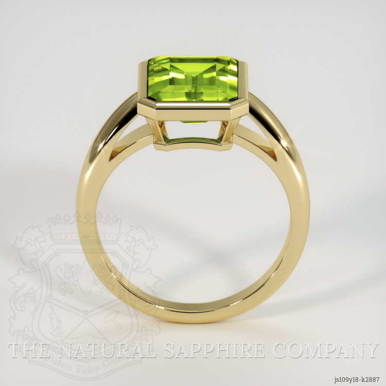 The men's ring features a beautiful, transparent 2.77 carat emerald cut shape green peridot with the dimensions of 9.98 x 7.99 x 4.59 mm and a emerald cut. It has a clarity grade of very slightly included (evaluated at eye level), intense color saturation, and an excellent polish. The origin of this peridot is Pakistan.