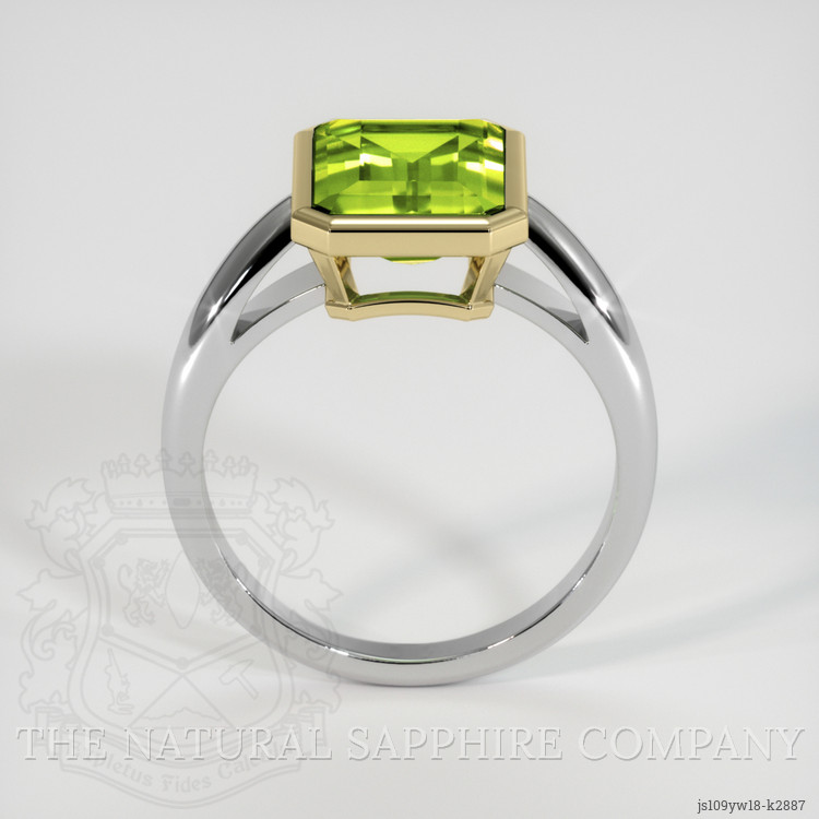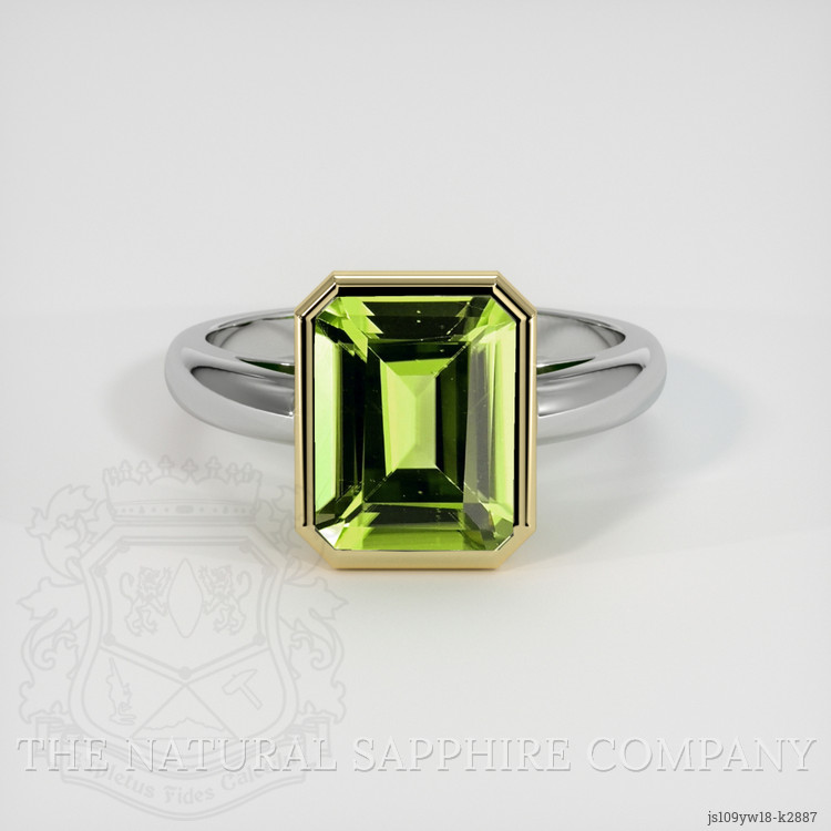 The men's ring features a beautiful, transparent 2.77 carat emerald cut shape green peridot with the dimensions of 9.98 x 7.99 x 4.59 mm and a emerald cut. It has a clarity grade of very slightly included (evaluated at eye level), intense color saturation, and an excellent polish. The origin of this peridot is Pakistan.