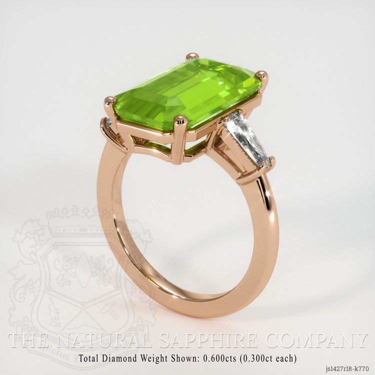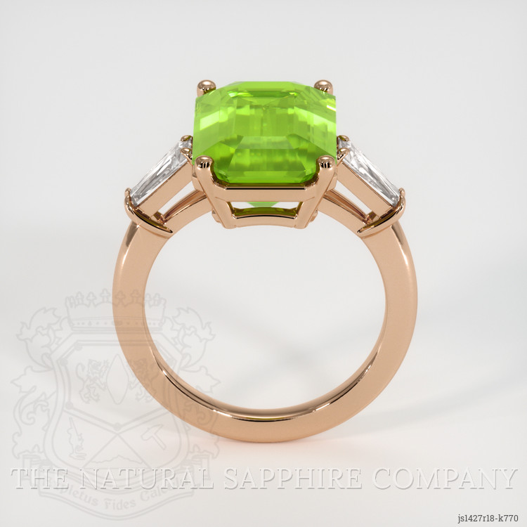 The ring features a beautiful, transparent 7.27 carat emerald cut shape green peridot with the dimensions of 15.28 x 9.66 x 5.86 mm and a emerald cut. It has a clarity grade of very slightly included (evaluated at eye level), intense color saturation, and an excellent polish. The origin of this peridot is Pakistan.
