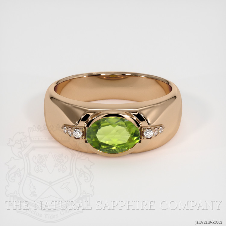 The men's ring is distinguished by a transparent 1.21 carat oval green peridot with dimensions of 8.11 x 6.13 x 3.38 mm. This mixed brilliant cut gemstone has a clarity grade of very slightly included, evaluated at eye level, with medium intense color saturation and an excellent polish. The peridot originates from Pakistan, providing a notable comparison to gemstones found in renowned rings due to its transparency and color quality. Accompanying the peridot are white round shaped diamonds. These consist of approximately 0.03 carats with a Very Slightly Included (VS1, VS2) clarity grade and a color grade of F. Additional diamonds include other sets weighing around 0.02 carats and 0.015 carats, respectively, both maintaining the same high standards of clarity and color. The entire setting of the ring is crafted in 18K Rose gold, enhancing the luxurious appeal of the featured gemstones.