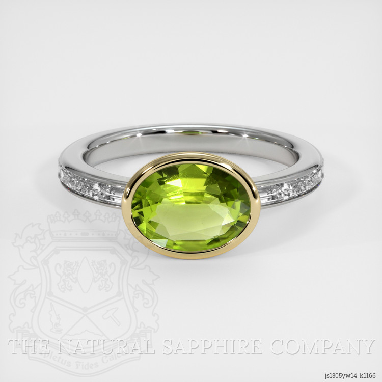 The ring features a beautiful, transparent 1.47 carat oval shape green peridot with the dimensions of 9.17 x 7.13 x 3.37 mm and a mixed brilliant cut. It has a clarity grade of very slightly included (evaluated at eye level), intense color saturation, and an excellent polish. The origin of this peridot is Pakistan.