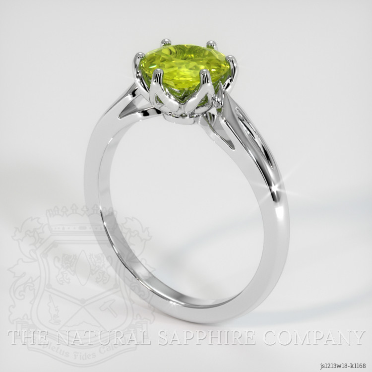 The ring features a beautiful, transparent 1.23 carat round shape green peridot with the dimensions of 7.32 x 7.22 x 3.16 mm and a mixed brilliant cut. It has a clarity grade of very slightly included (evaluated at eye level), intense color saturation, and an excellent polish. The origin of this peridot is Pakistan.