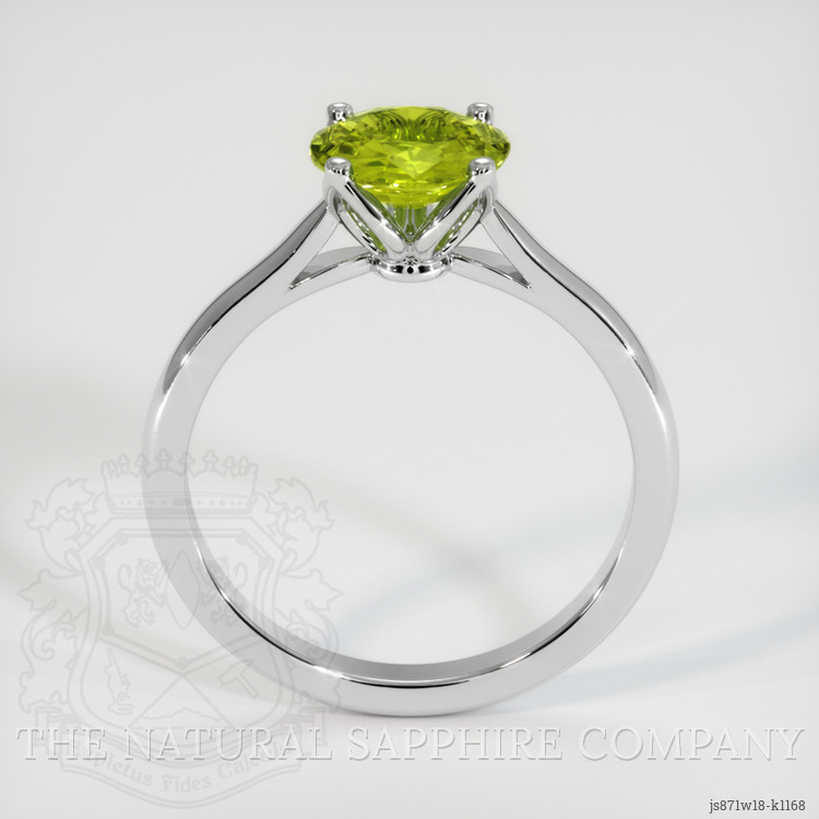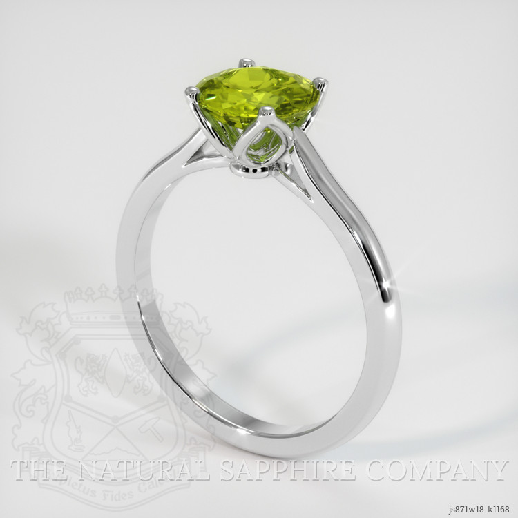 The ring features a beautiful, transparent 1.23 carat round shape green peridot with the dimensions of 7.32 x 7.22 x 3.16 mm and a mixed brilliant cut. It has a clarity grade of very slightly included (evaluated at eye level), intense color saturation, and an excellent polish. The origin of this peridot is Pakistan.
