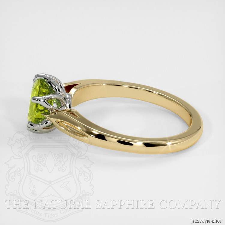 The ring features a beautiful, transparent 1.23 carat round shape green peridot with the dimensions of 7.32 x 7.22 x 3.16 mm and a mixed brilliant cut. It has a clarity grade of very slightly included (evaluated at eye level), intense color saturation, and an excellent polish. The origin of this peridot is Pakistan.