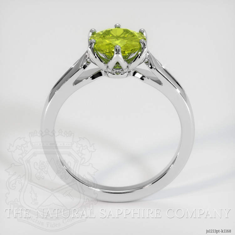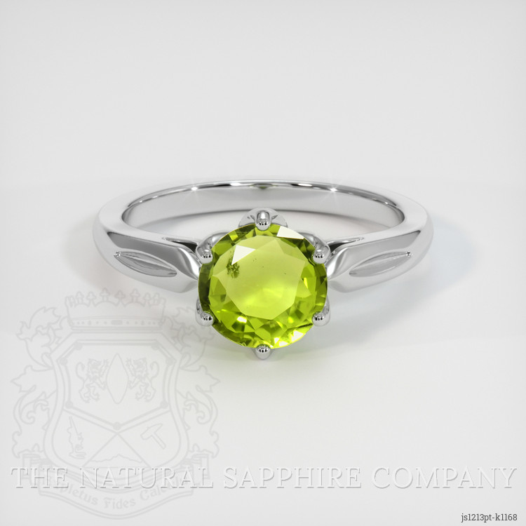The ring features a beautiful, transparent 1.23 carat round shape green peridot with the dimensions of 7.32 x 7.22 x 3.16 mm and a mixed brilliant cut. It has a clarity grade of very slightly included (evaluated at eye level), intense color saturation, and an excellent polish. The origin of this peridot is Pakistan.