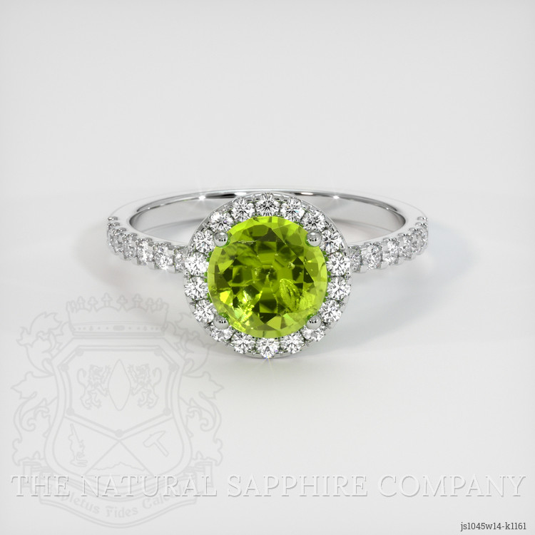 The ring features a beautiful, transparent 1.31 carat round shape green peridot with the dimensions of 6.95 x 7.06 x 4.48 mm and a mixed brilliant cut. It has a clarity grade of slightly included (evaluated at eye level), intense color saturation, and an excellent polish. The origin of this peridot is Pakistan.